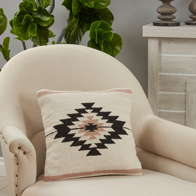 This decorative throw pillow features a woven Kilim-inspired design with geometric patterns in natural, black, and tan hues. Crafted from 100% cott...