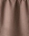 A classic gingham pattern. The colors are a blend of a warm, muted brown and a light, creamy beige, giving it a cozy and timeless look. The towel is hanging from a rope, and a baked good dusted with powdered sugar is visible in the lower right corner, suggesting a warm, rustic kitchen setting.