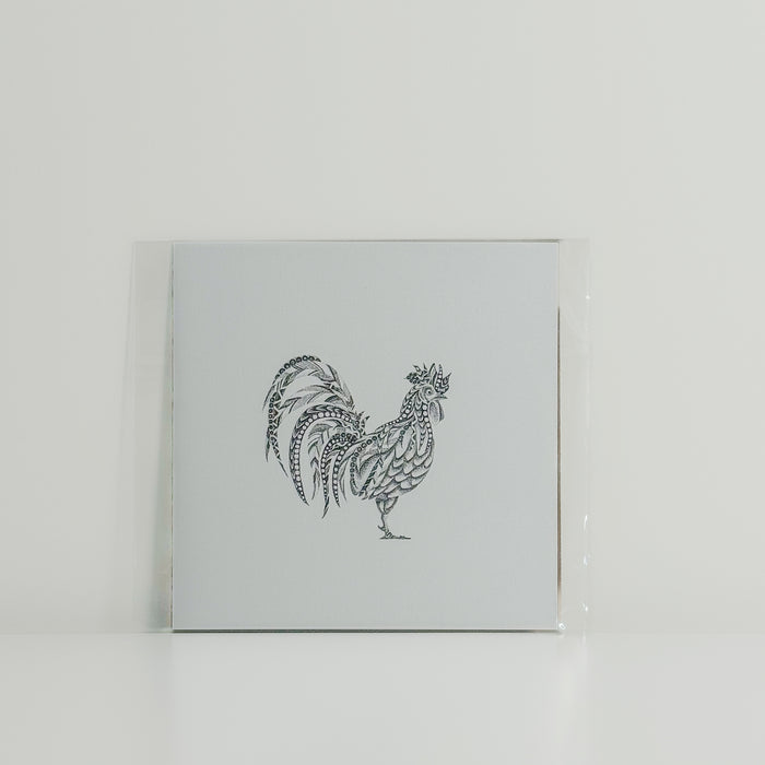 This charming 6x6 inch art print features a beautifully detailed black and white illustration of a rooster, rendered with intricate patterns and a distinctive artistic style.