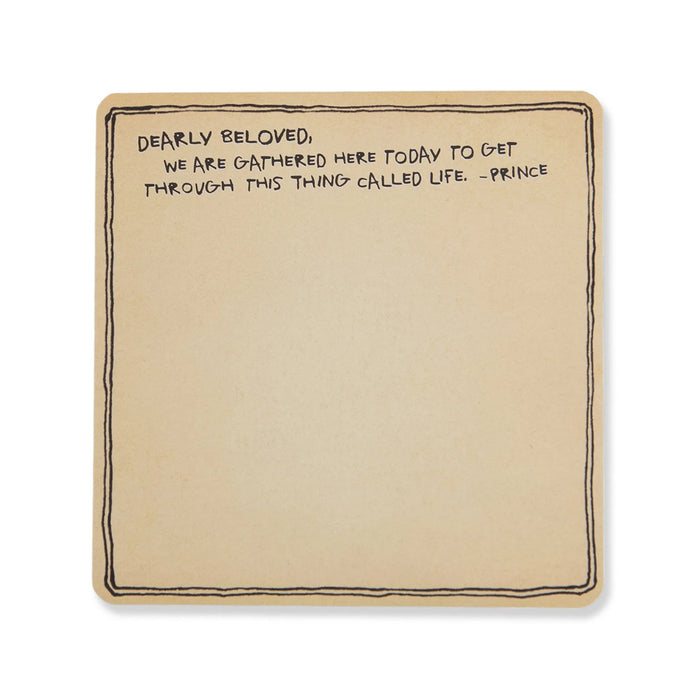Each notepad features the inspiring quote: "DEARLY BELOVED, WE ARE GATHERED HERE TODAY TO GET THROUGH THIS THING CALLED LIFE. -PRINCE".